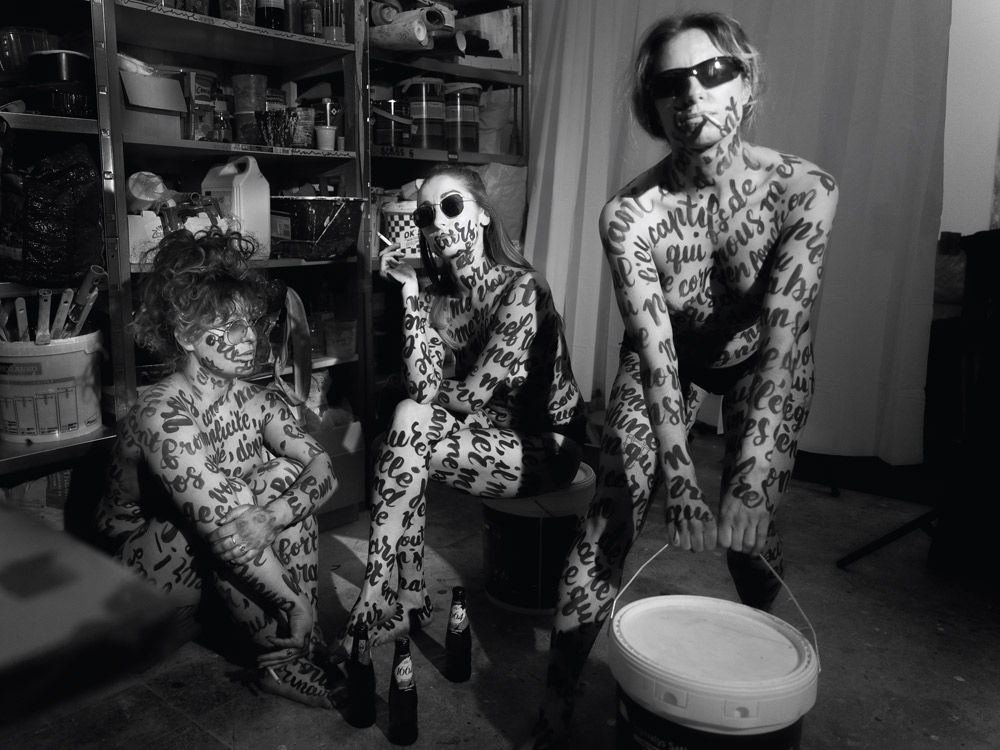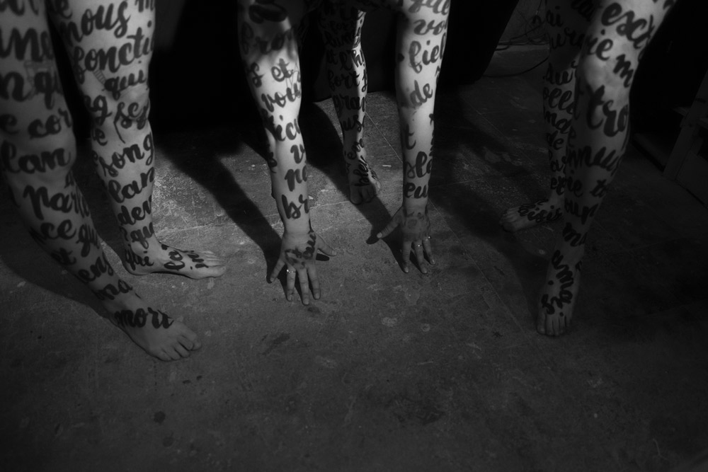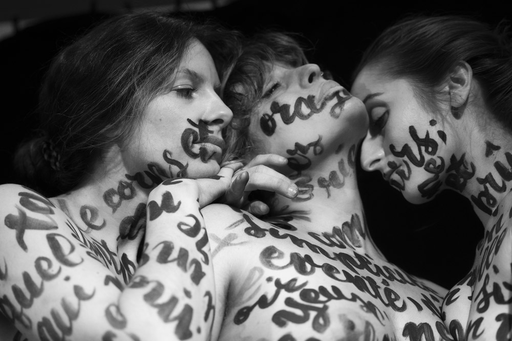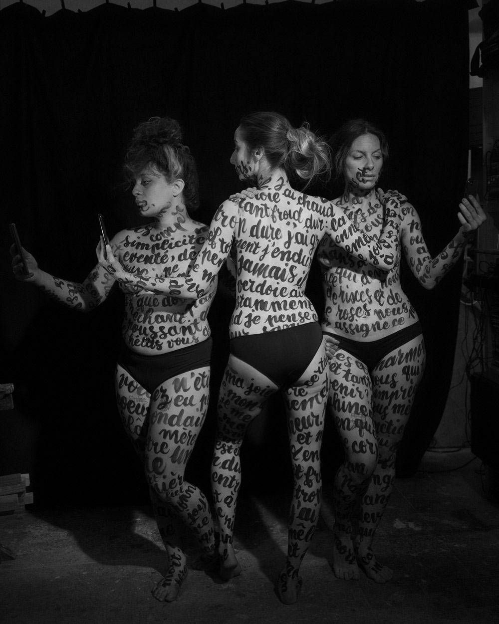 Trois poèmes ont orné les corps de mes copines: «Child wife» de Paul Verlaine, «Tant de corps et tant d’âme» d’Andrée Chedid et «Je vis, je meurs: je me brûle et me noie» de Louise Labé. Elles portaient un poème, comme on porterait un vêtement. Sur les photographies, des extraits de chaque poème se mêlaient et se recomposaient. Nous nous sommes inspirés des Trois Grâces, mais en leur apportant notre propre interprétation à travers ces textes, la mise en scène et le choix du décor.»
