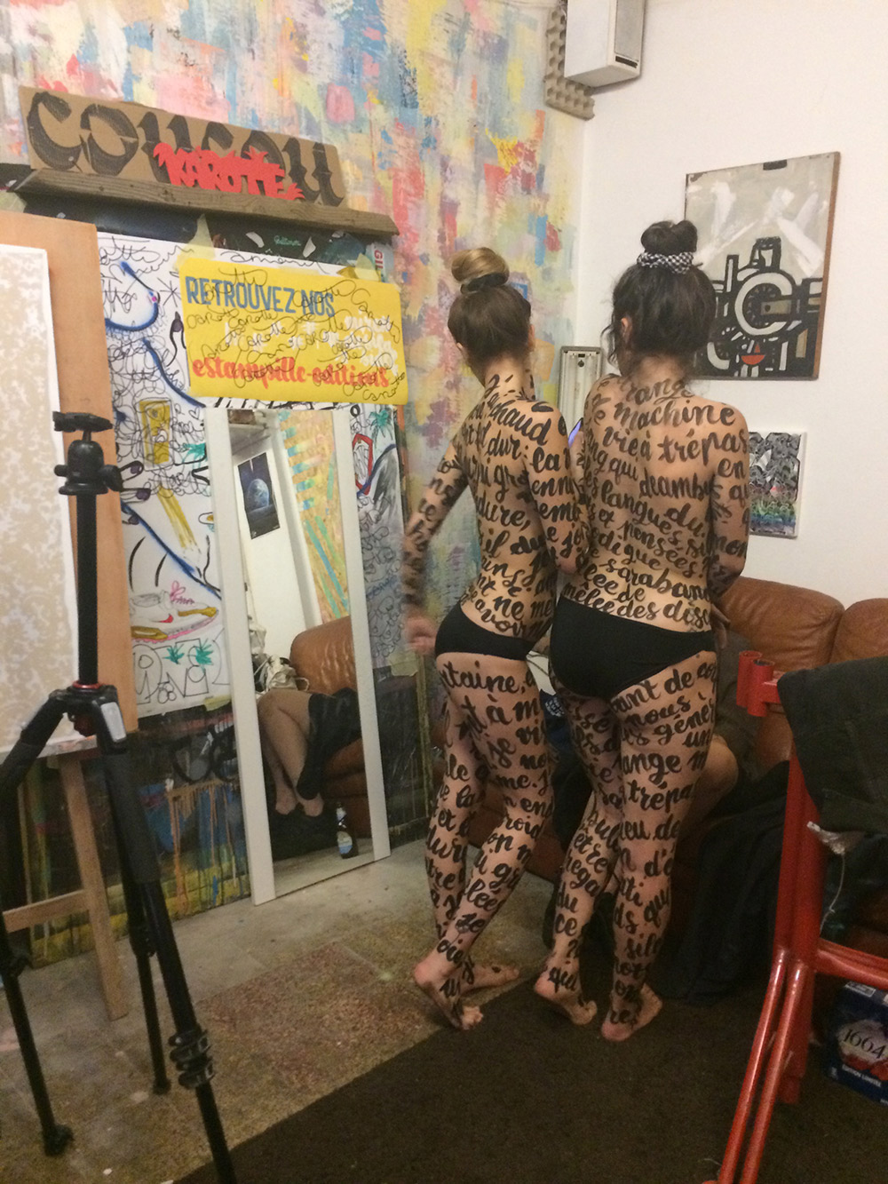 «Un jour, j’ai rassemblé trois modèles - Léa, Sandra et Solène - ainsi qu’une photographe, Debora Sansonnetti. Après avoir préparé l’atelier, j’ai passé la journée à peindre sur leurs corps. Pendant ce temps, Debora a capturé le processus en vidéo. En fin de journée, nous avons réalisé des images qui ont été exposées dans La vitrine au Créfad de la Loire.
