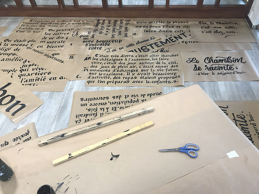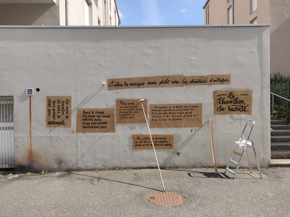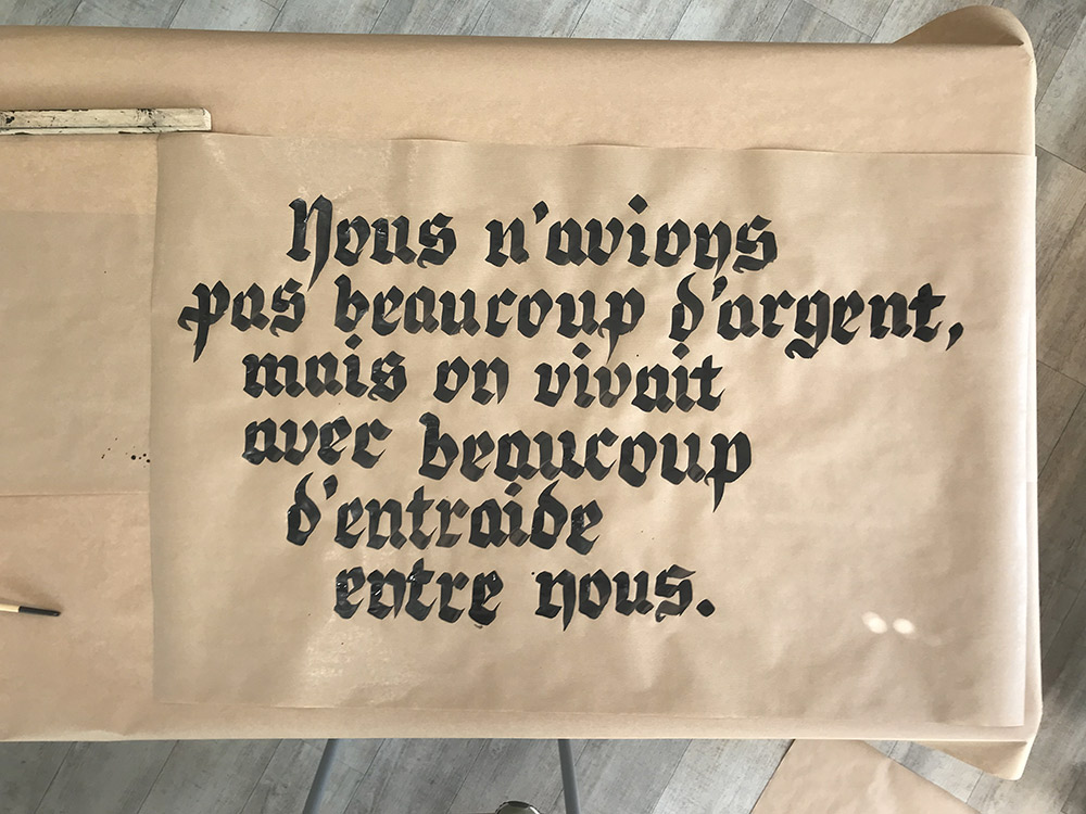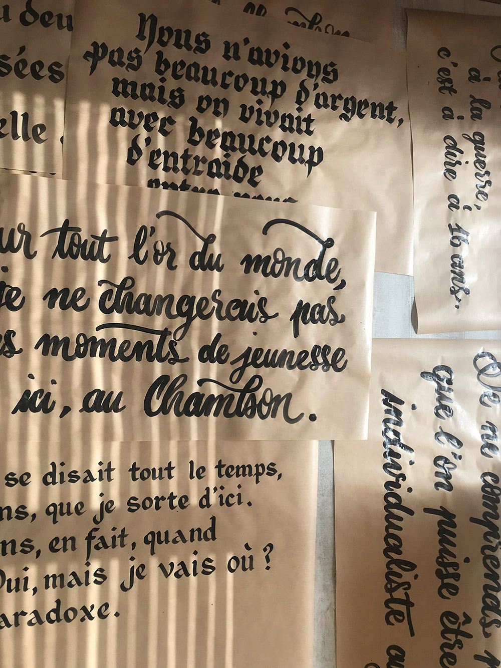 Suite à de nombreuses prises de sons avec Moan, j'ai pu retranscrire les entretiens en texte et les donner à lire. Les calligraphies ont été réalisé en médiathèque.